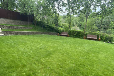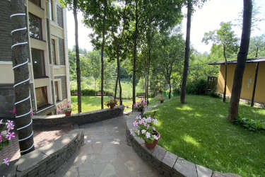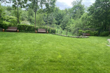 Высокие потолки, панорамные окна. Своя зеленая территория, где можно гулять и наслаждаться свежим воздухом.