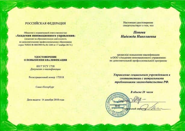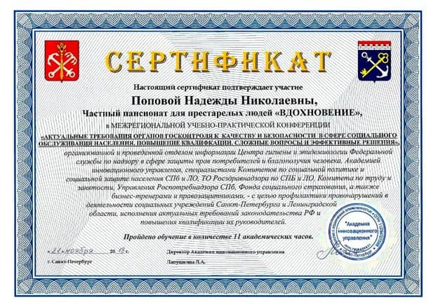 Попова Надежда Николаевна- руководитель пансионата «Вдохновение»: «Мы чувствуем каждого постояльца сердцем, ухаживаем с душой, лечим, используя профессиональные знания.